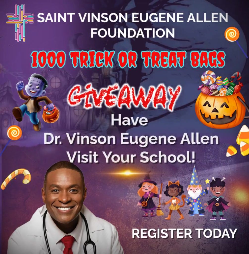 Schools sign up today! Get selected and Dr. Vinson Eugene Allen, Founder of Dusk to Dawn Urgent Care, will hand deliver 1,000 Halloween Gift Bags for students have access to treats for the 2025 Halloween celebration. This single event removes the pressure to provide a costly celebration, allowing them to focus resources elsewhere while guaranteeing their children experience the simple joy of childhood.